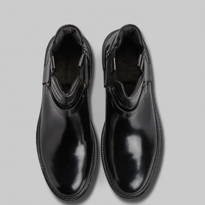 Our black gloss leather biker style Chelsea boot is made from Italian calf leather upper and lining. The sole is made from extra-light rubber, making you feel as if you are walking on air. Black 360 degrees of storm welting around the boot.
