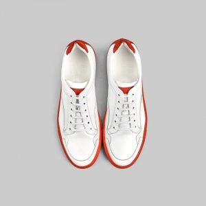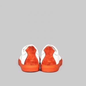 White calf sneaker with orange sole, calf leather upper and lining. One of one products from Kurt Lincoln, are truly one of ones and are only available in the size specified.